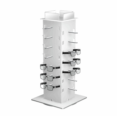 Rotating, countertop polar white acrylic display holds 28 pairs of glasses. Ships flat. Assembly in minutes.